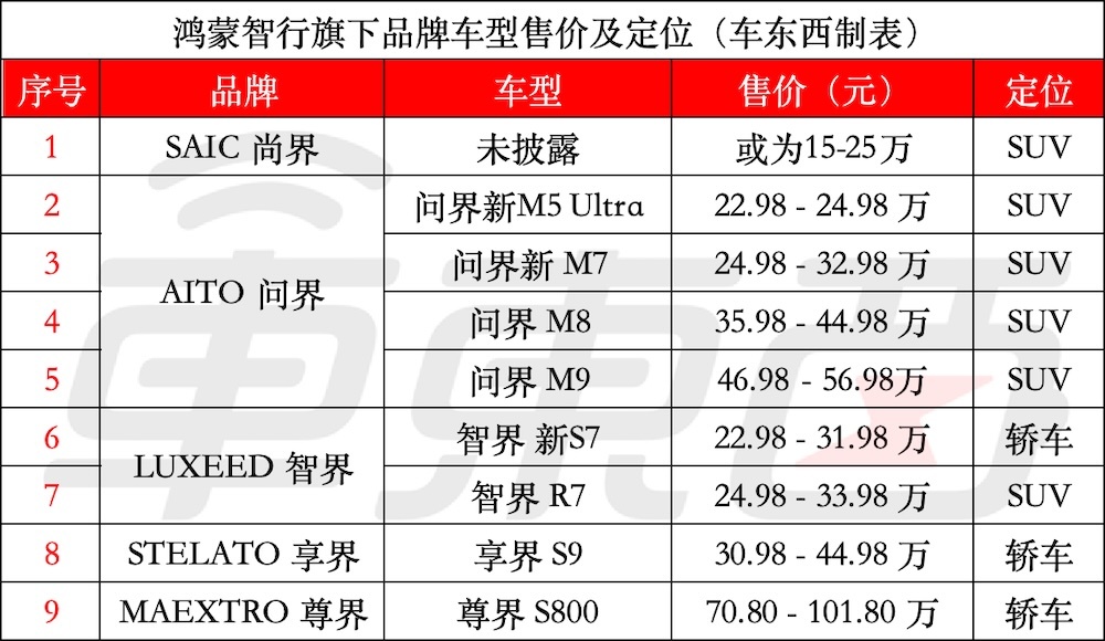▲鸿蒙智行旗下品牌全系车型售价及定位