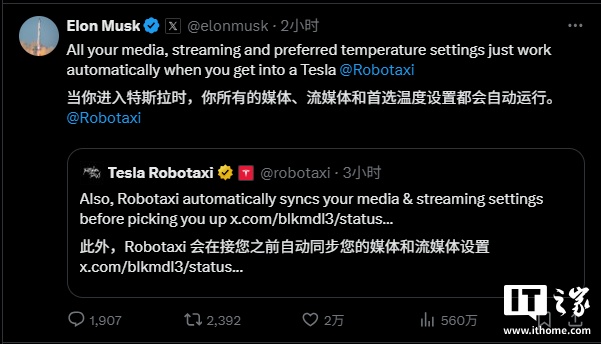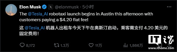 同时,特斯拉 CEO 马斯克称,当进入 Robotaxi 时,所有的媒体、流媒体和首选温度设置都会自动运行。马斯克还称,测试期统一每单收费 4.2 美元(IT之家注:现汇率约合 30.2 元人民币)。