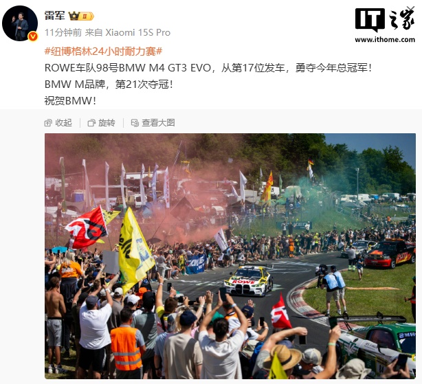 在该条博文中,雷军祝贺 ROWE 车队 98 号 BMW M4 GT3 EVO,从第 17 位发车勇夺今年纽博格林 24 小时耐力赛总冠军,这也是 BMW M 品牌第 21 次夺冠。