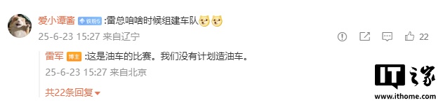 IT之家 6 月 23 日消息,今日有网友在小米创办人、董事长兼 CEO 雷军的评论区询问:“雷总,咱啥时候组建车队?”,雷军回复称:“这是油车的比赛。我们没有计划造油车。”