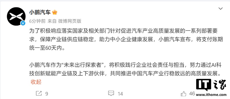 6 月 11 日,小鹏汽车宣布为了积极响应落实国家及相关部门针对促进汽车产业高质量发展的一系列部署要求,保障产业链供应链稳定,助力中小企业健康发展,将支付账期统一至 60 天内。小鹏汽车成为“造车新势力”中做出该承诺的首家车企。