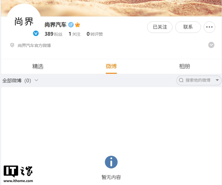 目前,该微博名为“尚界汽车”,头像为“尚界”二字的汉字文字,其认证信息显示为“尚界汽车官方微博”,目前暂未发布微博,截至IT之家发稿时已有 389 位粉丝。
