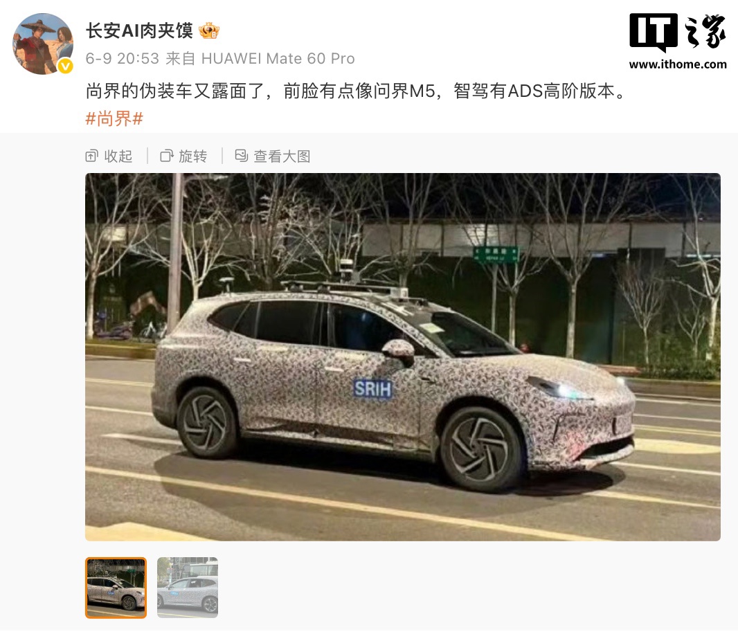此前,博主 @长安AI肉夹馍 曝光了尚界汽车的伪装车,该博主称其智驾有“ADS 高阶版本”,并表示其前脸“有点像问界 M5”。