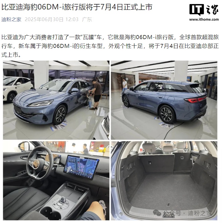 IT之家 6 月 30 日消息,比亚迪首款“瓦罐车”—— 海豹 06 DM-i 旅行版有望在 7 月 4 日上市。