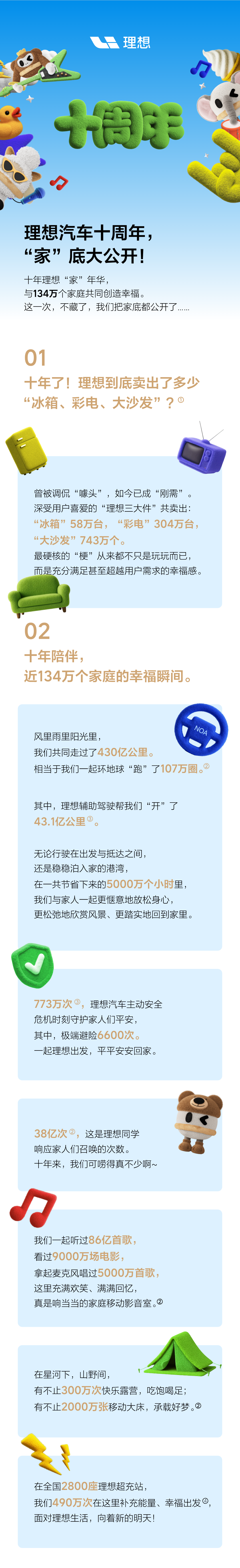 除此之外,这十年间理想汽车主动安全触发 773 万次,极端避险 6600 次,理想同学响应召唤 38 亿次,播放过 86 亿首歌、9000 万场电影,车内 K 歌 5000 万首。理想车主还有不止 300 万次露营,不止 2000 万张移动大床。