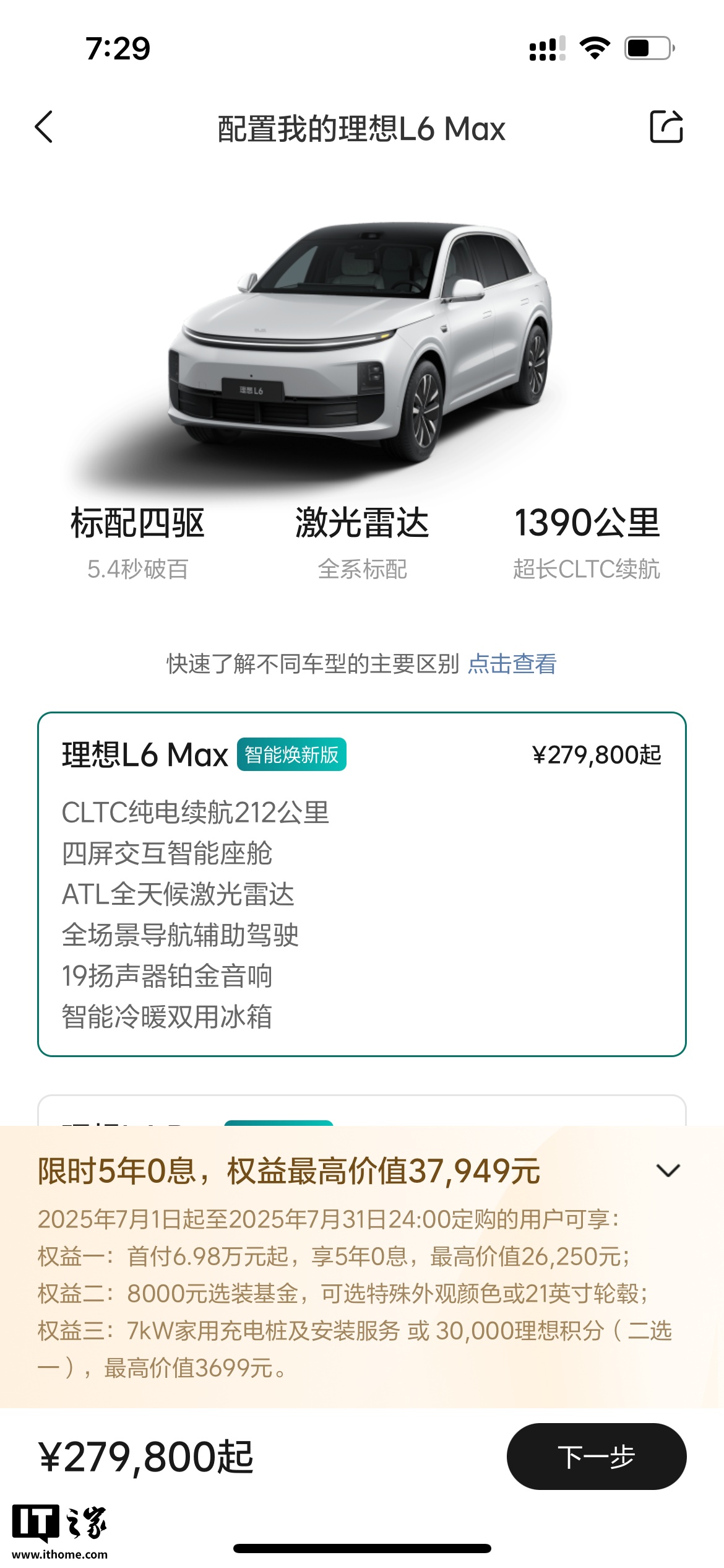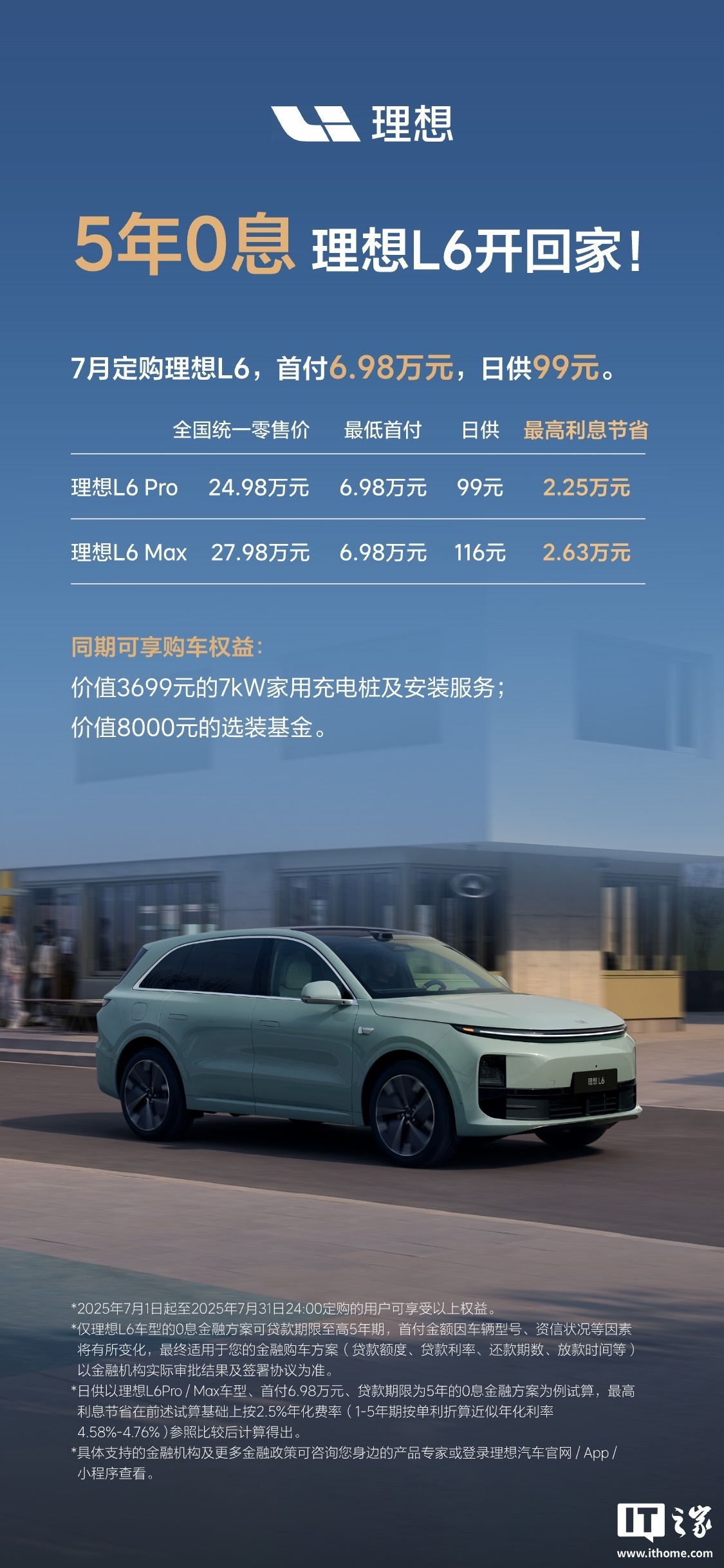 IT之家 7 月 1 日消息,理想汽车今日宣布,理想 L6 推出 5 年 0 息购车计划。7 月 1 日至 7 月 31 日 24:00 前订购理想 L6 的用户,最低首付仅需 6.98 万元,最低日供仅需 99 元。此外,用户还将获得价值 3699 元的 7kW 家用充电桩及安装服务,以及价值 8000 元的选装基金。