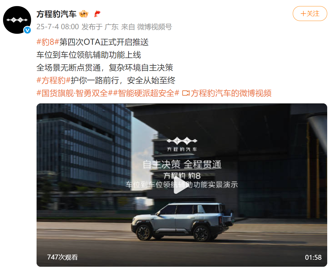 凤凰网科技讯 7月4日,比亚迪旗下的新能源个性品牌方程豹汽车在微博发布了车位到车位领航辅助功能的实景演示。该功能作为豹8第四次OTA升级的新增亮点,为用户带来更智能、便捷的驾驶体验。