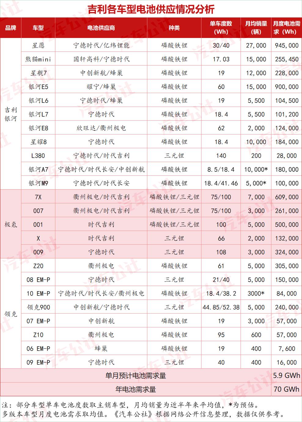 简单根据目前吉利旗下银河、极氪、领克所有规划,和在售车型对动力电池需求和销量来看,2025年全年吉利对电池的需求就将会达到70GWh,但到2027年吉曜通行才能够达到这个能力,再加上以吉利控股来说,无论是沃尔沃、路特斯还是宝腾,以及商用车集团的远程品牌,这一块领域对电池的需求也并不小。