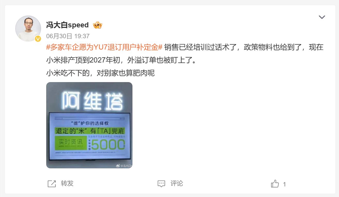 但面对近一年的排队时间,以及明年结尾款时还要交购置税,他不认为自己对小米的“爱”能够跨越这一年的等待,对小米YU7也不至于喜欢到这个地步。另外,小米SU7目前的交付周期仍然徘徊在38周左右,换算下来差不多要10个月,如果不是只看中小米汽车,也保不准谁能坚持这么久。