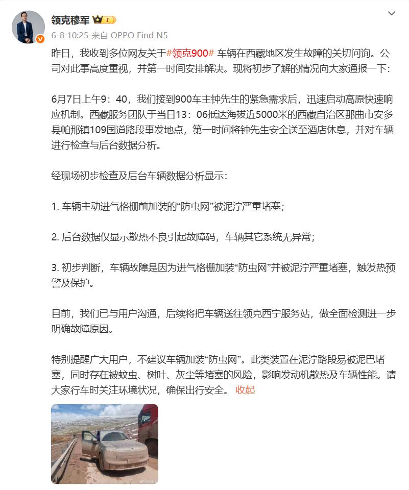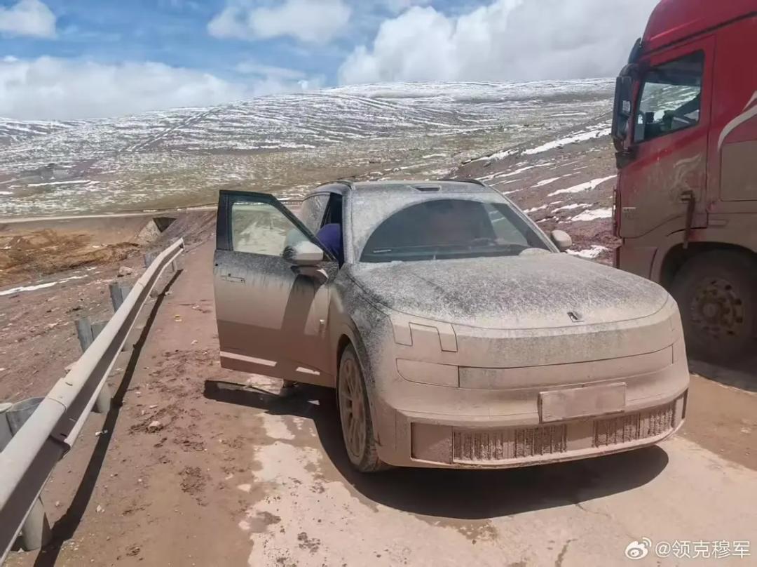 为啥脖子哥会问这个问题,因为在 6 月 8 号,有辆领克 900 在西藏趴窝了,可以看到这车头全是泥,这个进气格栅是被完全堵住了。