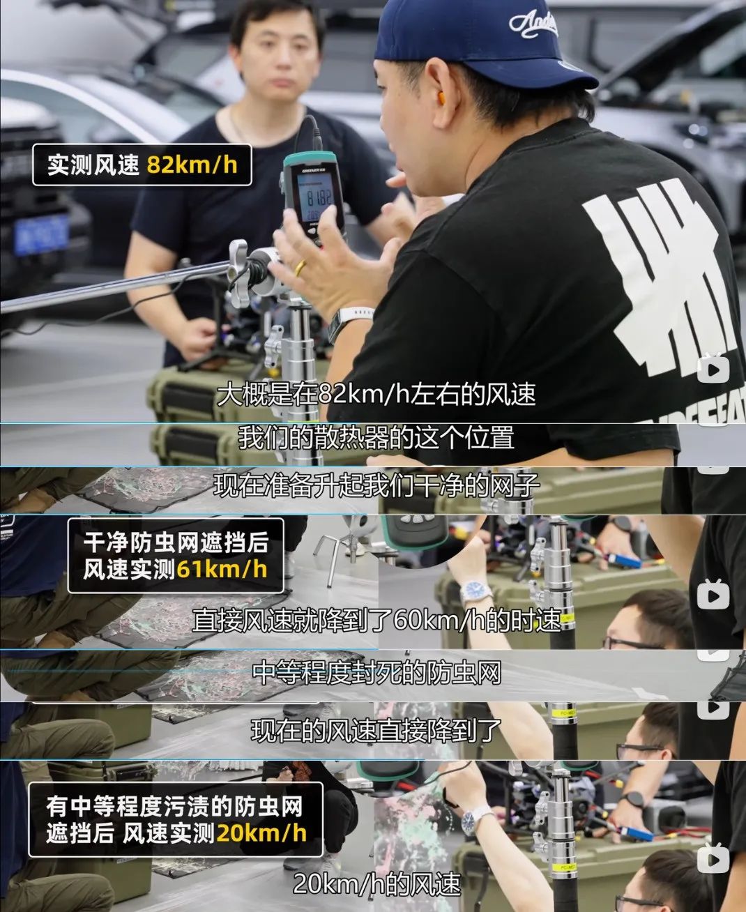 网上也有很多相关测试,比如韩璐大叔这个视频,可以看到在没有任何污渍的防虫网后面,风速都会降低。虽然这些测试不太严谨,但也可以作为参考。