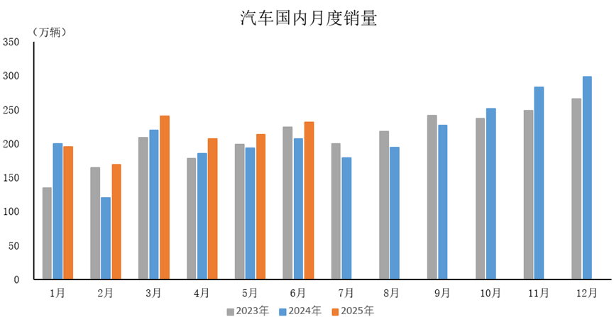 2025年6月,汽车国内销量231.2万辆,环比增长8.3%,同比增长11.9%。2025年1-6月,汽车国内销量1257万辆,同比增长11.7%。