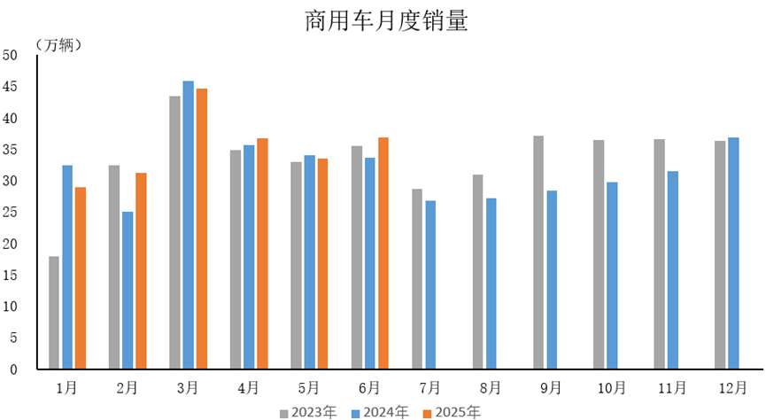 2025年6月,商用车产销分别完成35.4万辆和36.9万辆,环比分别增长5.3%和10.3%,同比分别增长7.1%和9.5%。2025年1-6月,商用车产销分别完成209.9万辆和212.2万辆,同比分别增长4.7%和2.6%。