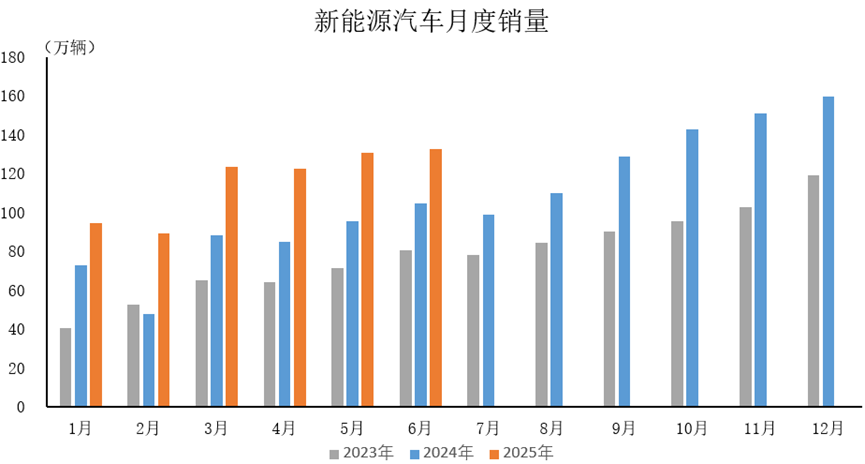 2025年6月,新能源汽车产销分别完成126.8万辆和132.9万辆,同比分别增长26.4%和26.7%;新能源汽车新车销量达到汽车新车总销量的45.8%。2025年1-6月,新能源汽车产销分别完成696.8万辆和693.7万辆,同比分别增长41.4%和40.3%;新能源汽车新车销量达到汽车新车总销量的44.3%。