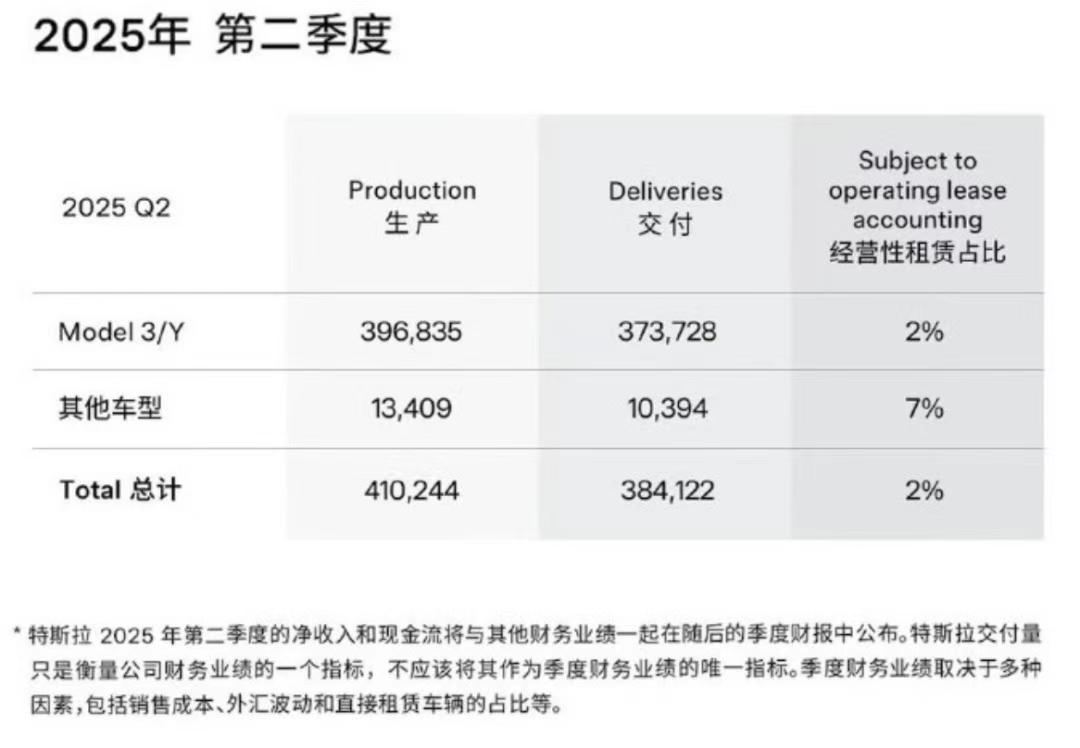 汽车业务低迷的原因无非就是销量不好,2025年第二季度新车交付量为38.41万辆,比去年第二季度减少了约6万辆,同比下降13.48%。尽管强于市场的悲观预期35万辆,但仍是特斯拉史上最大单季交付量降幅。
