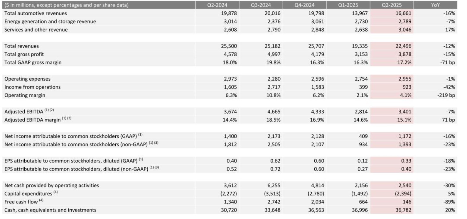 7月23日,特斯拉公布2025年第二季度财报称,公司 Q2总收入为224.96亿美元,同比下降12%;总毛利润为38.78亿美元,同比下降15%。