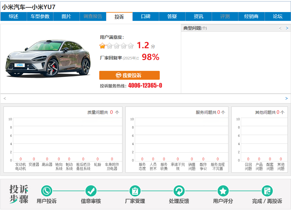 或许受到交付问题影响,小米YU7在车质网上的用户满意度只有1.2分(5分制)。