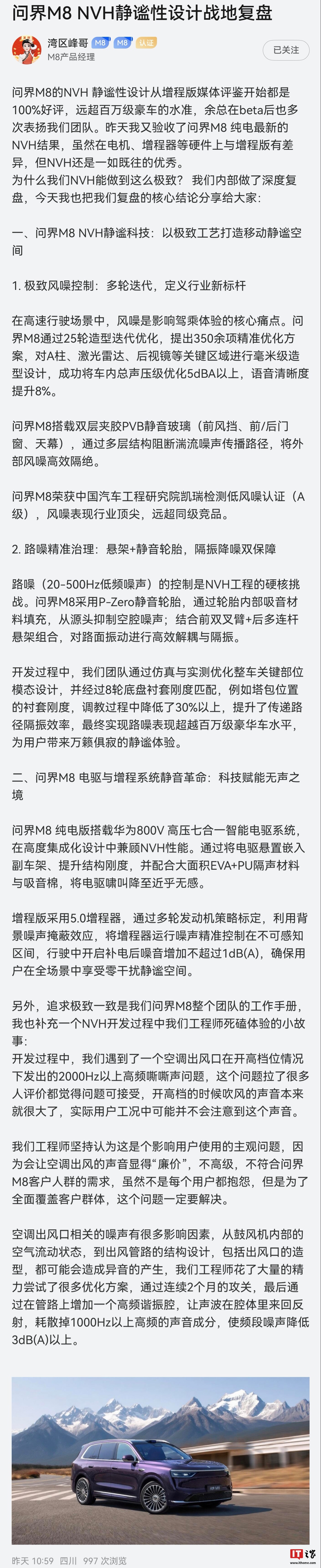 IT之家 7 月 23 日消息,M8 产品经理 @湾区峰哥 昨日在鸿蒙智行 App 复盘了问界 M8 车型的 NVH 静谧性设计,并透露已验收问界 M8 纯电最新的 NVH 结果:“虽然在电机、增程器等硬件上与增程版有差异,但 NVH 还是一如既往的优秀”。