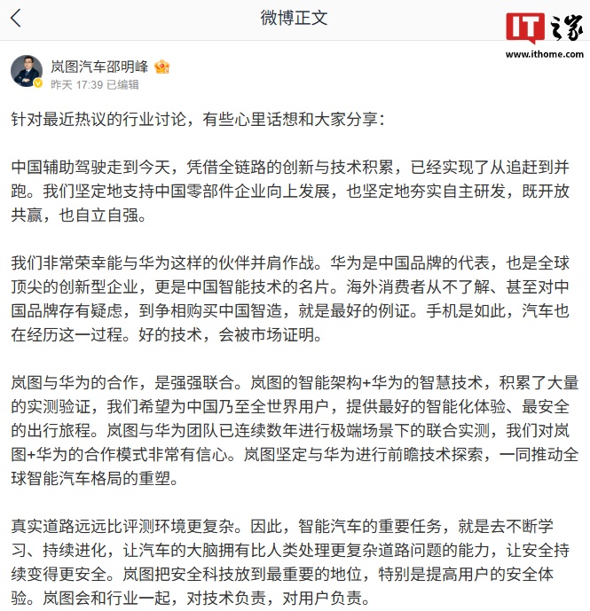 IT之家注意到,岚图汽车 CBO、销售公司总经理邵明峰在表达“懂车帝封闭高速测试如同一面镜子,映照出行业在极端场景下仍存技术共性瓶颈”这一观点后,又在昨日晚通过微博发表了对智能辅助驾驶的看法。原文如下: