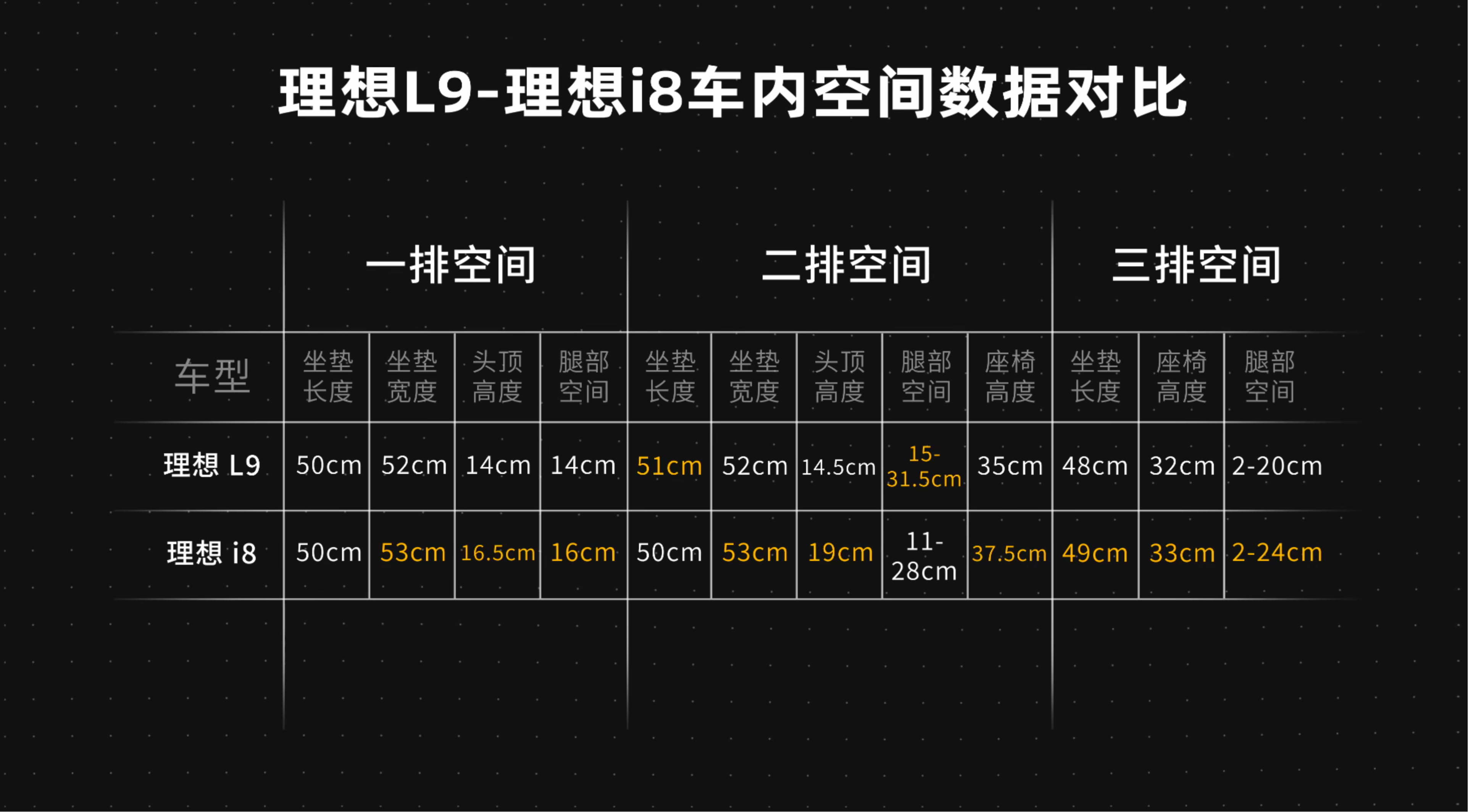 理想i8定位为中大型纯电SUV,采用2+2+2六座布局,车身尺寸为 5085×1960×1740mm,轴距达 3050mm。根据《凤凰车研所》实测数据,理想i8在外尺寸略小的前提下,车内实际的乘坐空间不逊色于理想L9。