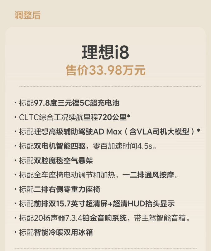 基于此需求,理想汽车决定理想汽车决定统一配置版本——以理想i8 Max作为标准配置,并将售价从34.98万元调整为33.98万元,同时赠送价值10,000元的铂金音响,并提供后舱娱乐屏套装作为选装,价格10,000元;原以36.98万元选择Ultra版本的用户,只需要34.98万元的价格,即可实现原选择的全部配置;原选择Pro版本的用户,理想汽车将为其退订或升级。