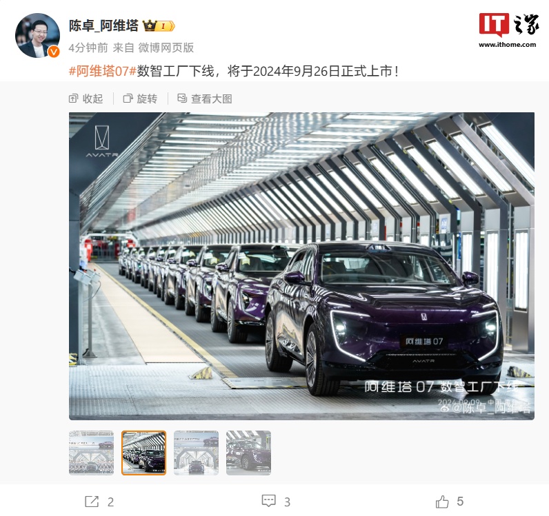 IT之家 9 月 9 日消息,今天傍晚,阿维塔科技总裁陈卓发文宣布,阿维塔 07 已在位于重庆的数智工厂下线,将于 9 月 26 日正式上市。