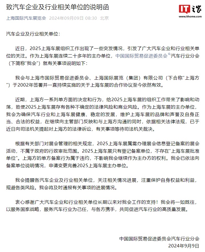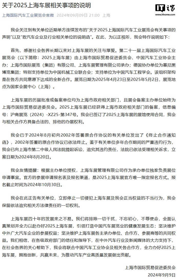 9 月 9 日晚间,上海贸促会官微发布“关于 2025 上海车展相关事项的说明”: