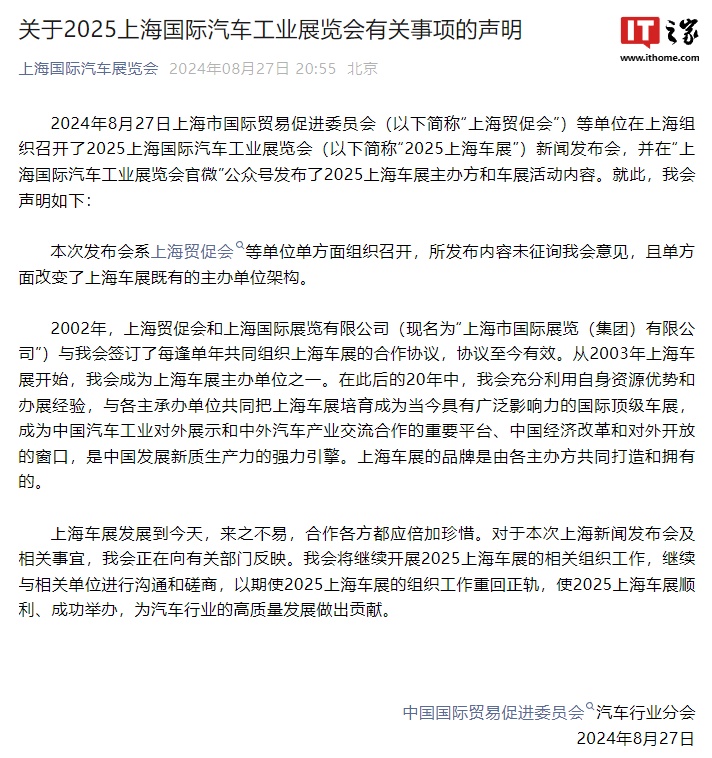中国国际贸易促进委员会汽车行业分会随后发文:“本次发布会系上海贸促会等单位单方面组织召开,所发布内容未征询我会意见,且单方面改变了上海车展既有的主办单位架构。”