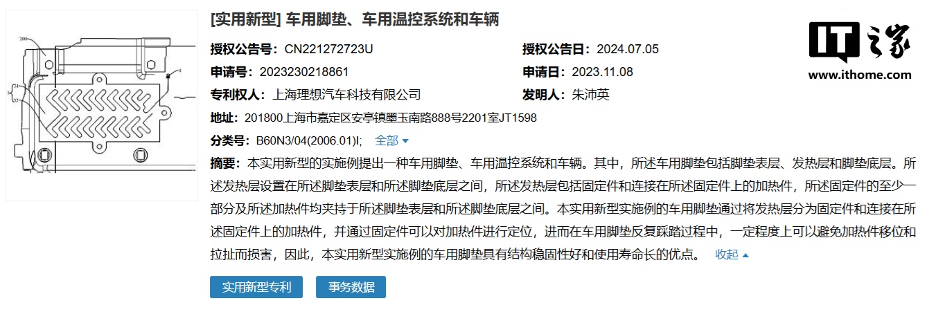 根据最新的专利申请,理想汽车不只满足于此,该公司今年 7 月公开了一项“车用脚垫、车用温控系统和车辆”专利,旨在通过配备加热功能的车用脚垫来提升驾驶时的体验。这项技术特别针对冬季驾驶时车内温度较低的问题,尤其是脚部的保暖,因为传统空调系统往往难以覆盖到脚部区域。