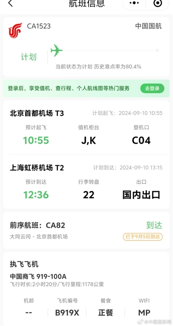 9月11日起国航C919将执飞北京首都-上海虹桥/杭州两条航线,分别为北京首都-上海虹桥CA1507、上海虹桥-北京首都CA1508;北京首都-杭州萧山CA1722、杭州萧山-北京首都CA1727。