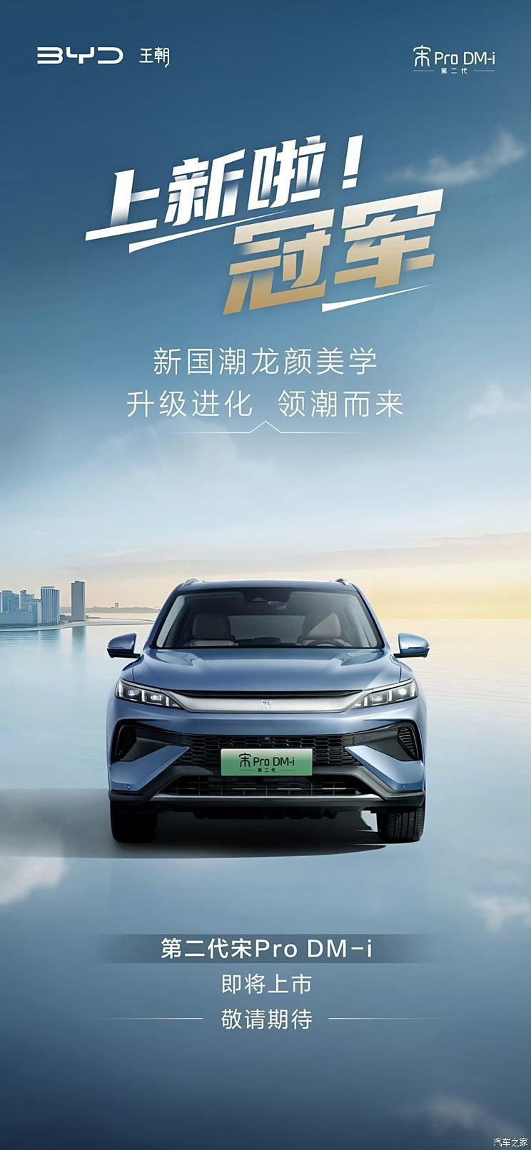 [汽车之家 资讯] 日前,比亚迪官方发布了一张第二代宋Pro DM-i的预告图,并表示新车即将上市。新车定位紧凑型SUV,将搭载比亚迪最新的第五代DM插电混动技术。