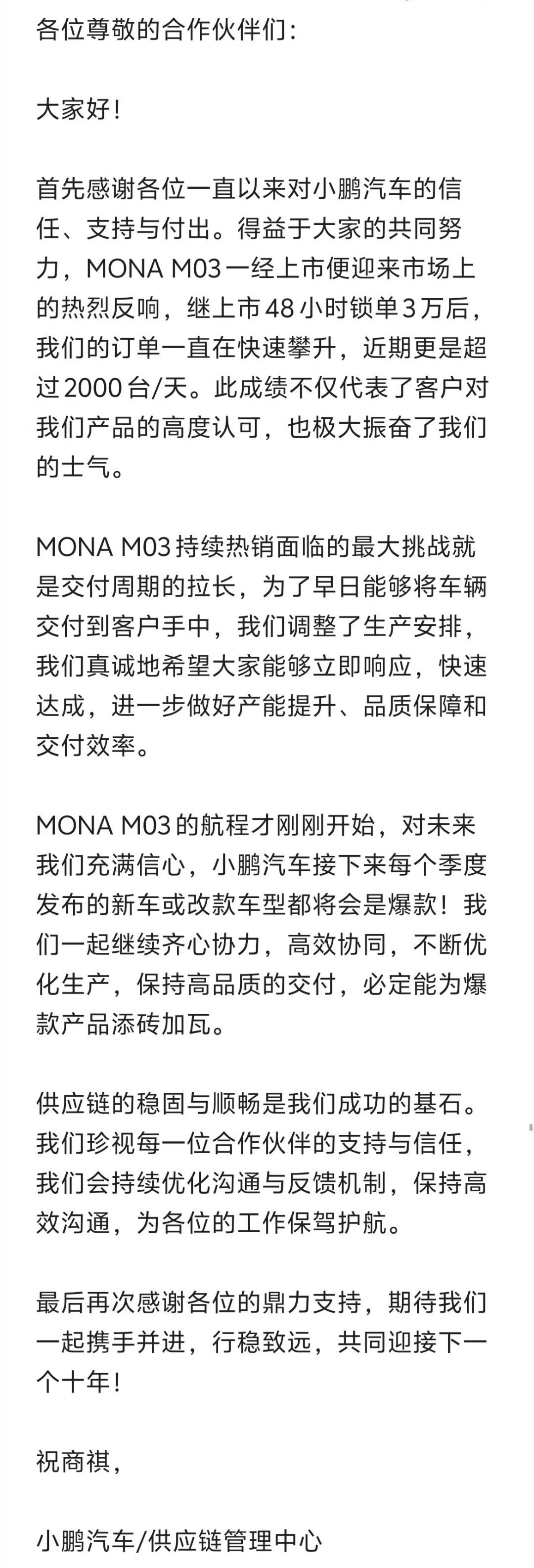 内部信显示,小鹏汽车于日前调整生产安排,为保障 MONA M03 产能提升、品质和交付效率要求供应商伙伴积极响应、快速达成。