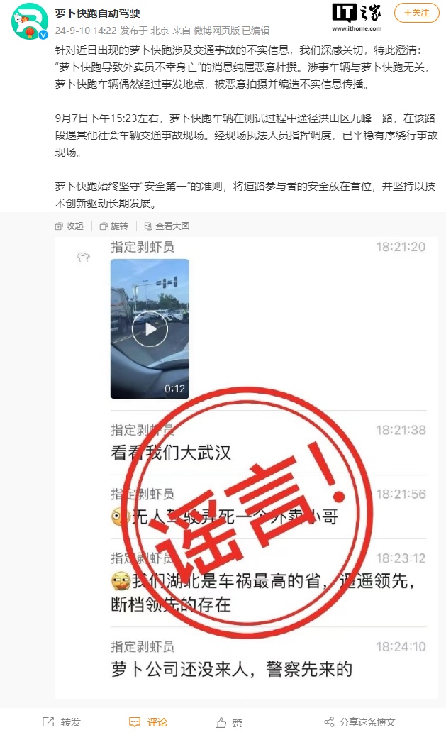 IT之家 9 月 10 日消息,有武汉市民发视频称萝卜快跑发生事故导致一名外卖小哥死亡。对此,萝卜快跑官方今日发表了回应: