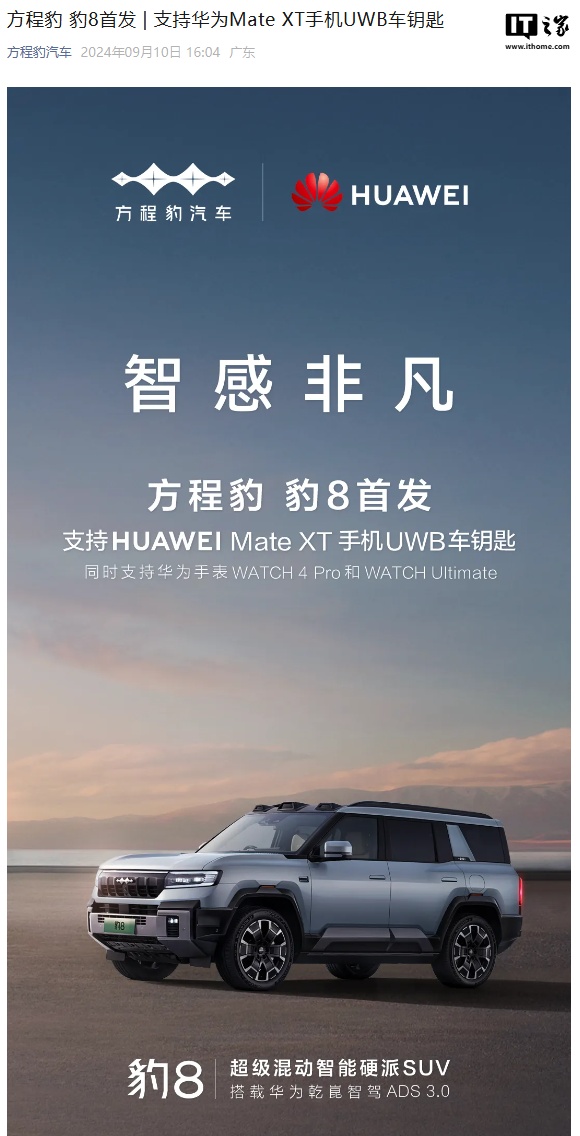 新机发布后,比亚迪方程豹汽车官宣,豹 8 车型首发支持华为 Mate XT 手机 UWB 车钥匙,同时支持华为手表 WATCH 4 Pro 和 WATCH Ultimate。