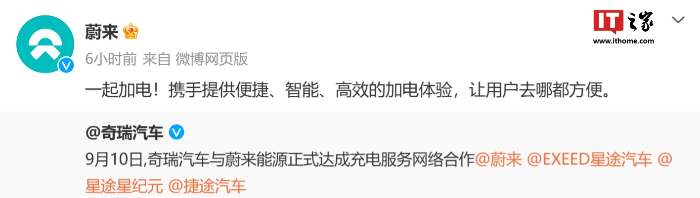 IT之家 9 月 10 日消息,奇瑞汽车今日宣布,安徽奇瑞绿能生态科技有限公司(奇瑞绿能)与武汉蔚来能源有限公司(蔚来能源)正式达成充电网络服务合作。