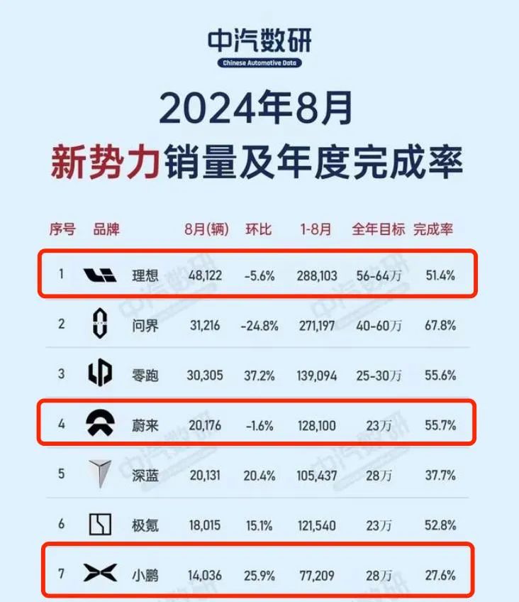 图/2024年8月新势力销量来源/中汽数研 新能源观截图