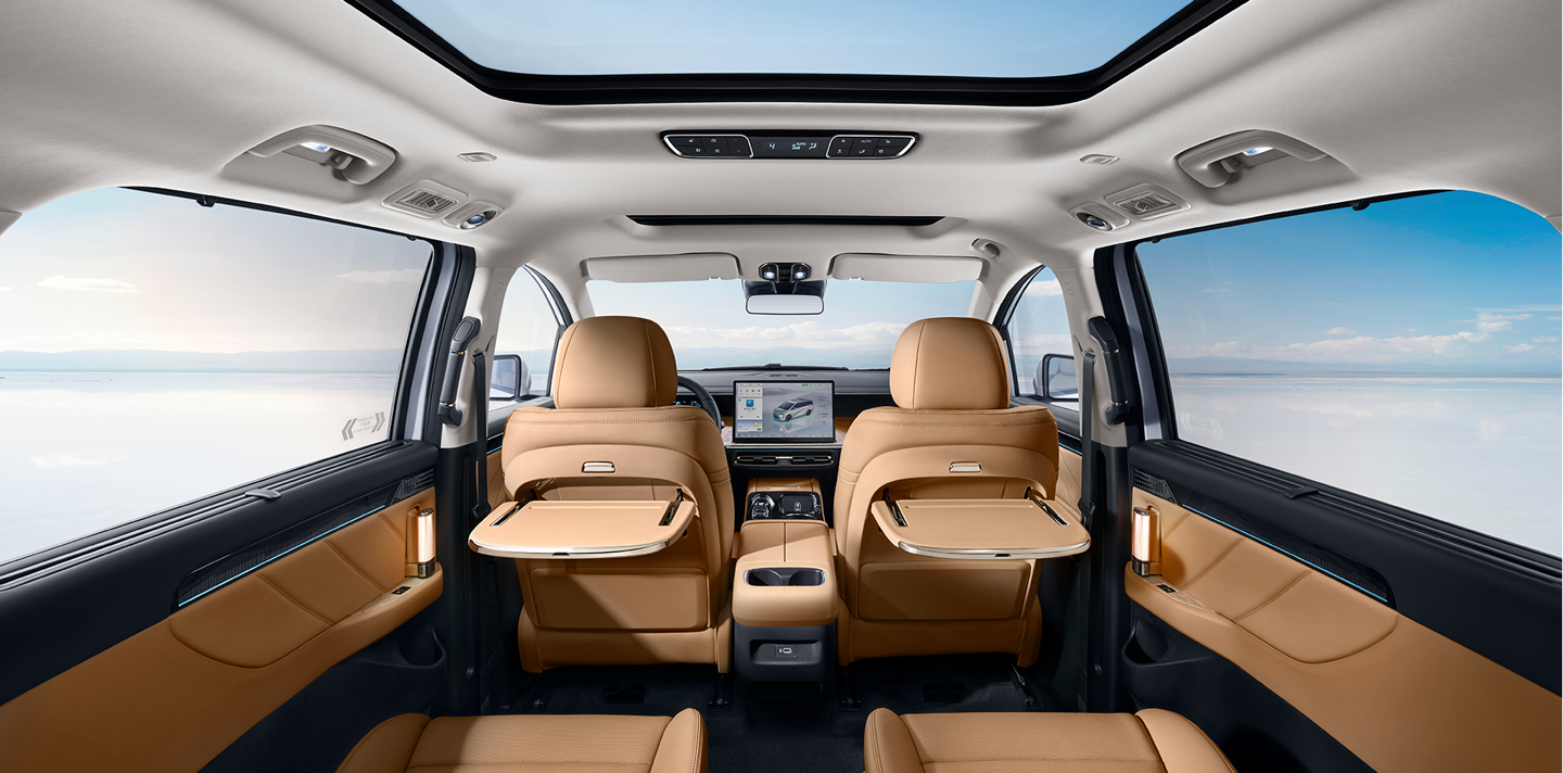 舒适性配置方面,新车标配方向盘加热、自动防眩目内后视镜、前排座椅通风加热、氛围灯、后排小桌板、二排零重力座椅、后排隔音玻璃和手动侧窗遮阳帘。新车依旧采用 7 座布局,后备厢容积为 345-1917 升。