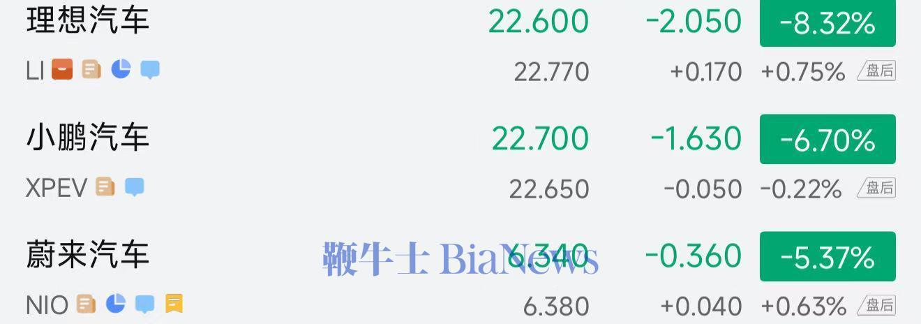 截至收盘,理想汽车跌8.32%,报每股22.6美元;小鹏汽车跌6.7%,报每股22.7美元;蔚来汽车跌5.37%,报每股6.34美元。
