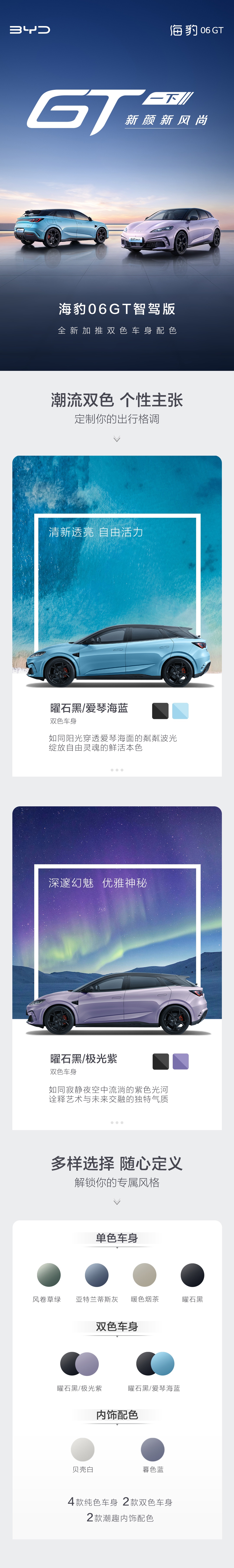 IT之家 8 月 28 日消息,比亚迪汽车今天上午宣布,海豹 06 GT 将新增两款双拼色:曜石黑 + 爱琴海蓝、曜石黑 + 极光紫。