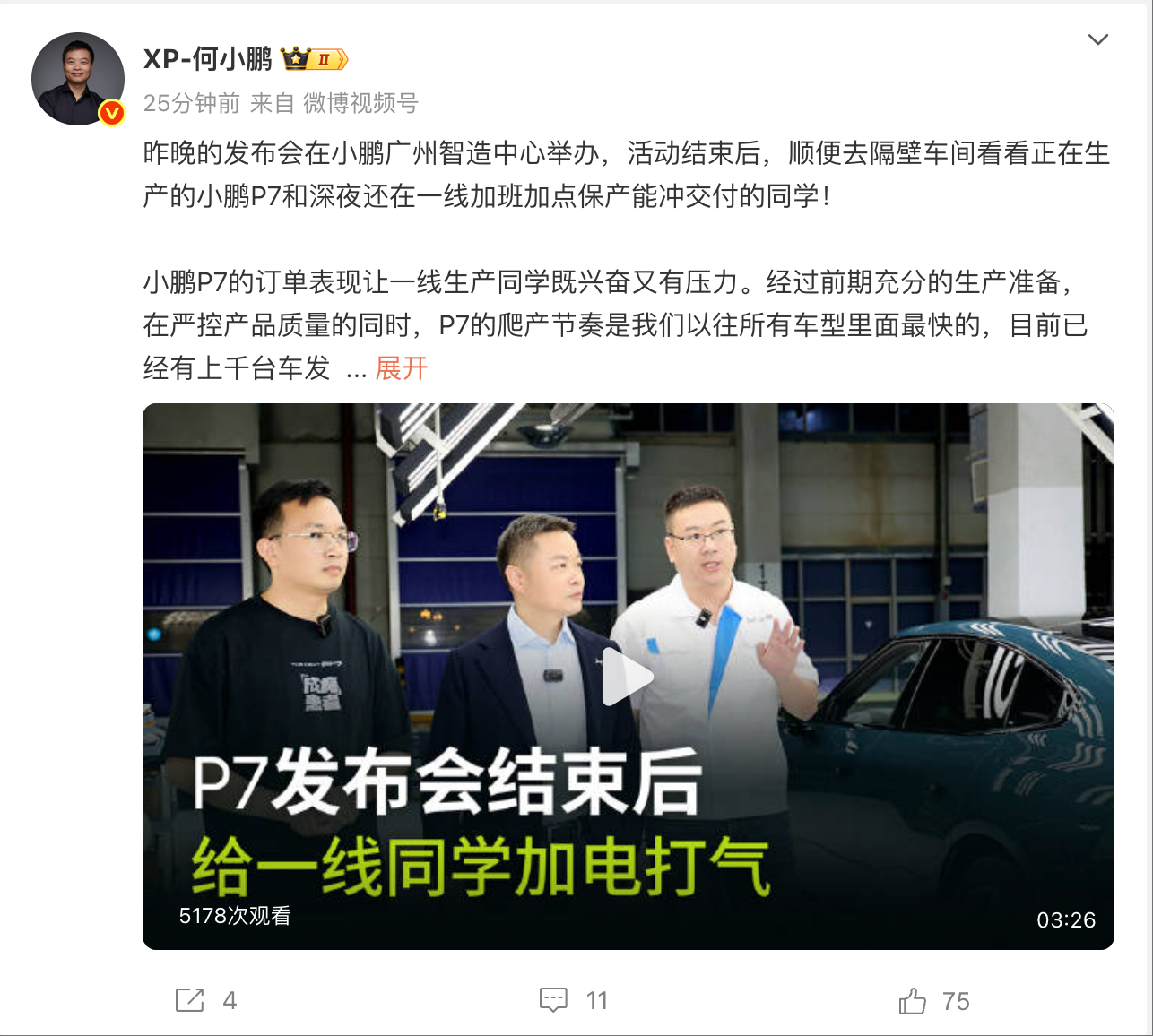 凤凰网科技讯 8月28日,小鹏汽车董事长何小鹏发微博称,经过前期充分的生产准备,在严控产品质量的同时,P7的爬产节奏是以往所有车型里面最快的,目前已经有上千台车发往全国各地。