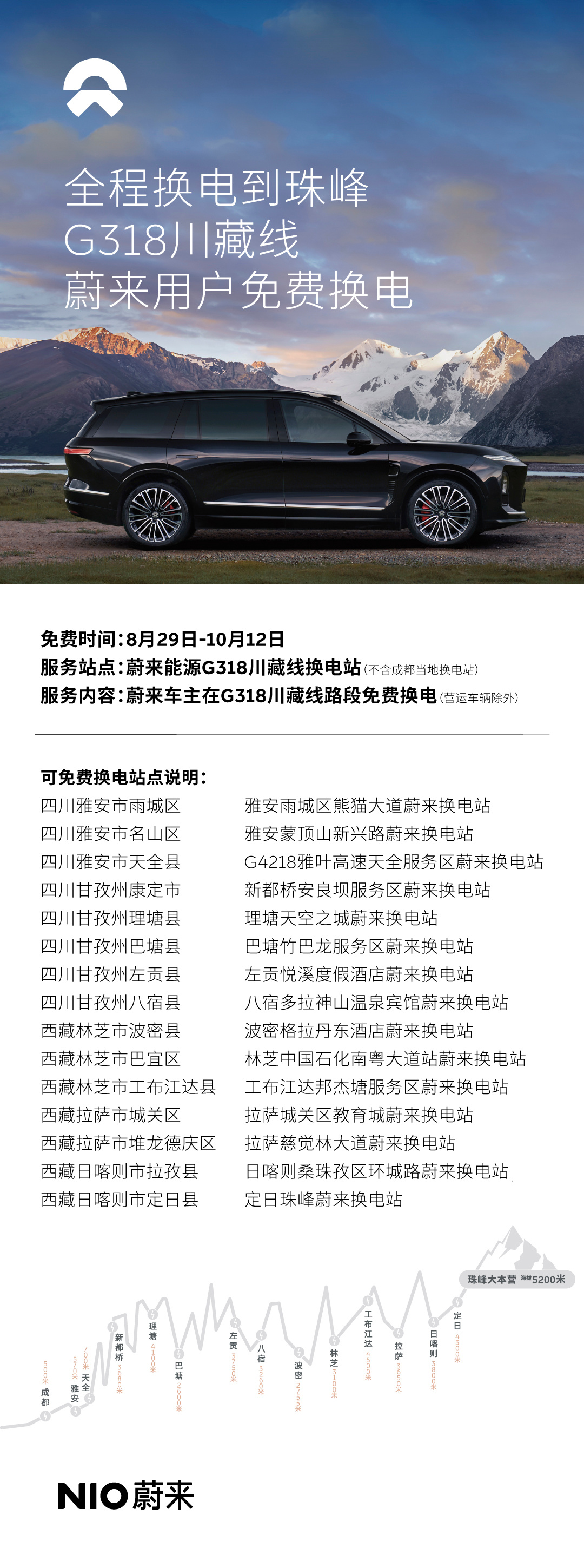 IT之家 8 月 28 日消息,蔚来汽车今日宣布,2025 年 8 月 29 日至 10 月 12 日,G318 川藏换电路线将向蔚来、乐道用户提供不限次数免费换电服务,让更多的用户无忧抵达远方。