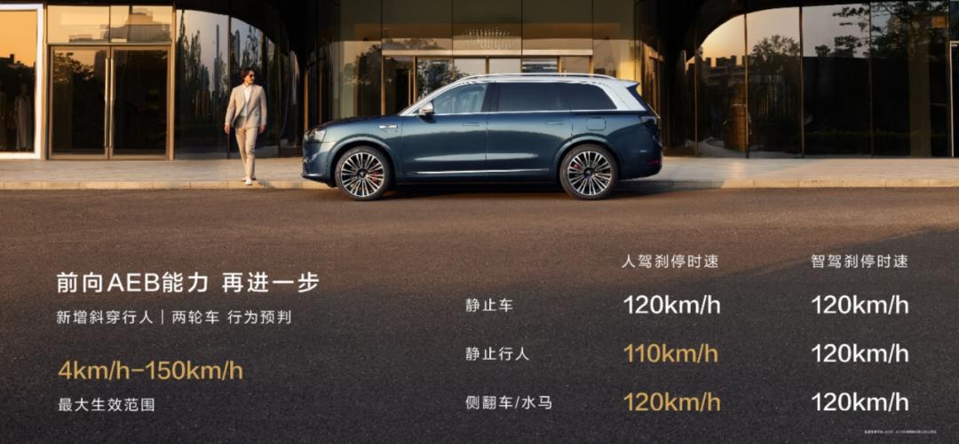 同时,问界M9前向AEB能力得到了加强,现在能够支持对斜穿行人和两轮车行为的预判,其最大生效范围为4-150km/h。在智驾与人驾协同的情况下,刹停时速可以提升至120km/h,而在静止行人场景下,人驾的刹停时速可以达到110km/h。