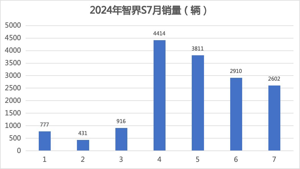 至少,从目前终端数据来看,智界S7自今年4月第二次上市以来,交付情况有所改善,但不算优异,今年4月至7月销量分别为4414辆、3811辆、2910辆和2602辆。