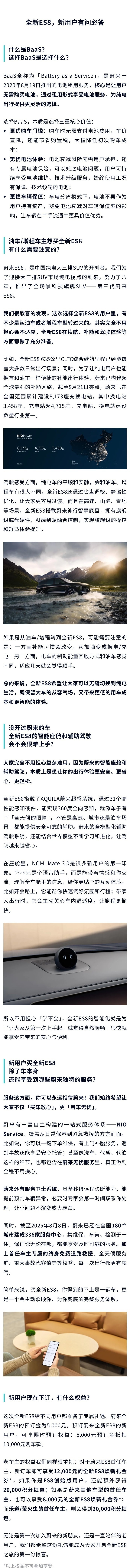 如果是从油车/增程转到全新ES8,可能需要注意的是:一方面补能习惯会改变,从加油变成换电/充电;另一方面,电车的制动能量回收方式和油车感觉不同,适应几天就会觉得顺手。问答还提到,全新ES8 635公里CLTC综合续航里程已经能覆盖大多数日常出行场景;截至8月21日零点,蔚来已在全国范围建设8173座充换电站,其中换电站3458座、充电站超4715座。