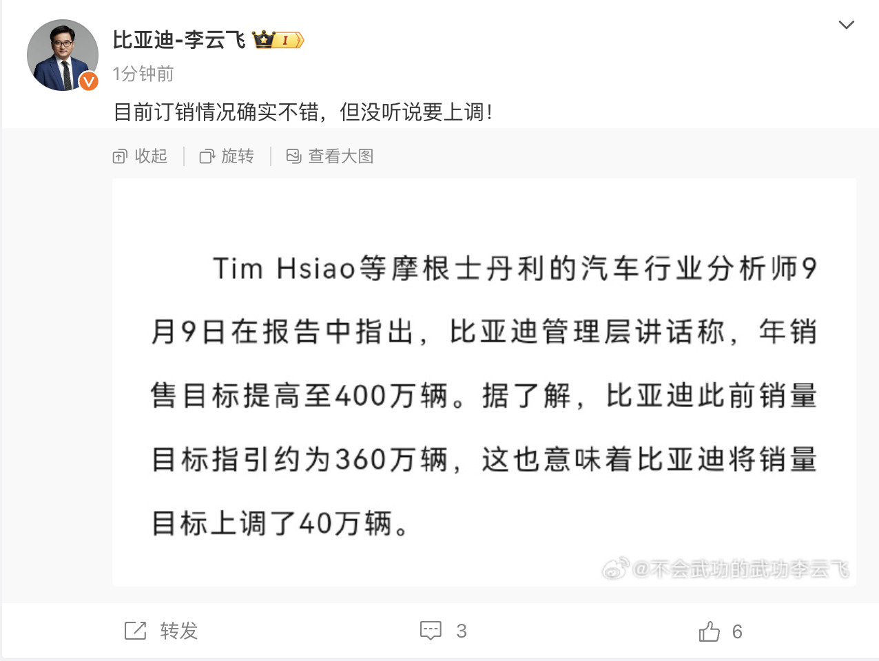 凤凰网科技讯 9月11日,针对“分析师称比亚迪汽车年销量目标上调至400万辆”的报道,比亚迪品牌及公关总经理李云飞回应表示,目前订销情况确实不错,但没听说要上调。