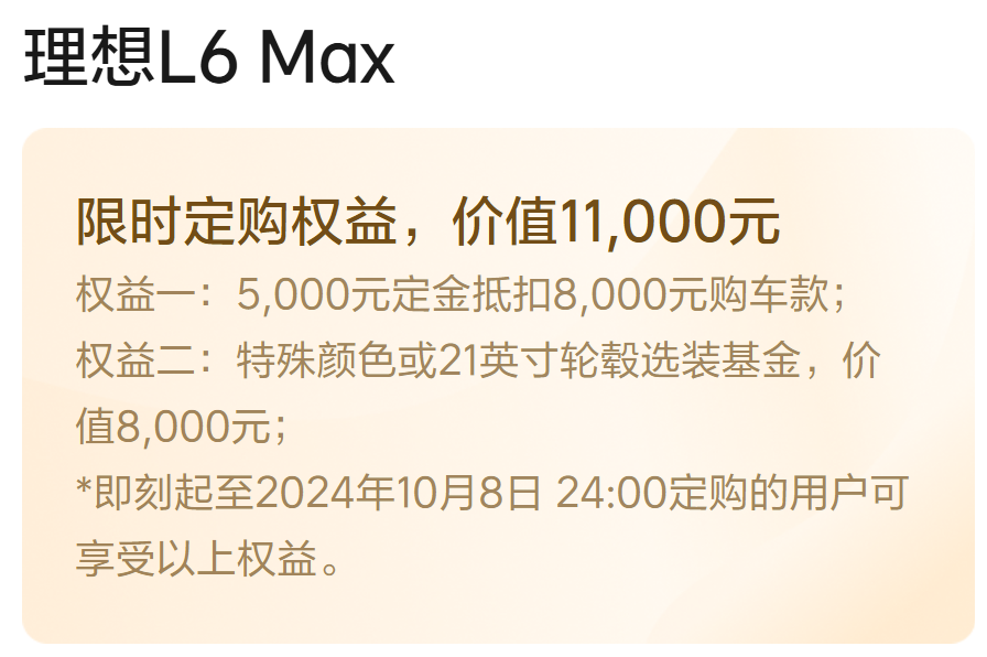 截至 10 月 8 日 24:00,理想 L6 专属 8000 元选装基金权益限时开放。可用于抵扣铂金音响选装(价值 1 万元、即支付 2000 元升级),也可用于 21 英寸轮毂、特殊颜色选装。