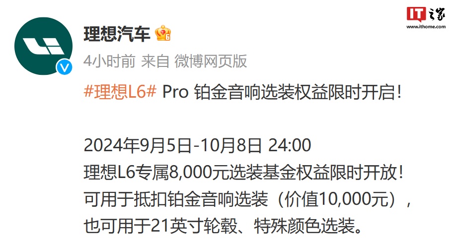 IT之家 9 月 11 日消息,理想汽车宣布,理想 L6 Pro 铂金音响选装权益限时开启。