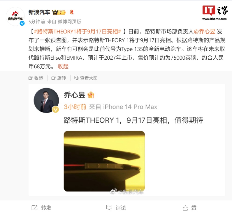 IT之家 9 月 11 日消息,路特斯市场负责人乔心昱今天发文宣布,路特斯旗下最新车型“THEORY 1”将于 9 月 17 日亮相。