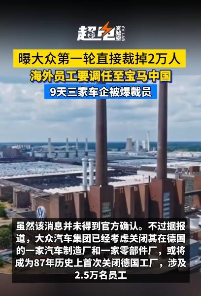 9月9日有媒体报道称,德国大众汽车集团裁员,第一轮或直接裁掉2万人。报道称在大众汽车集团裁员风波下,海外员工要调任至宝马中国,直接和中国友商竞争。不过该消息目前还未得到官方确认。
