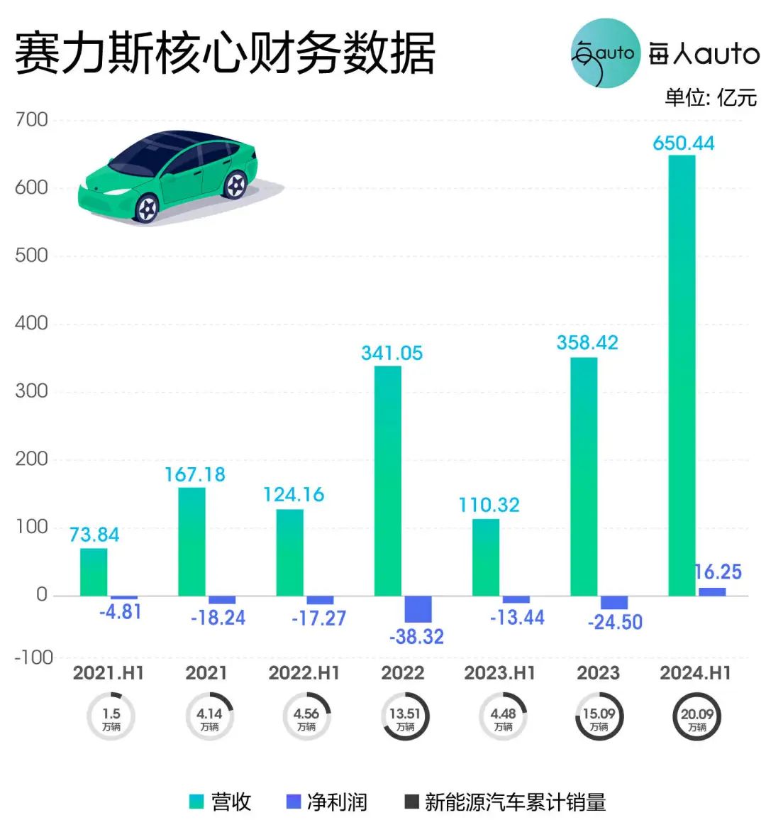 只看2024年上半年的营业收入,就已经远超2023全年的358.42亿元,几乎翻了一倍。净利润方面,赛力斯在2022年和2023年还分别亏了38.32亿元和24.50亿元。